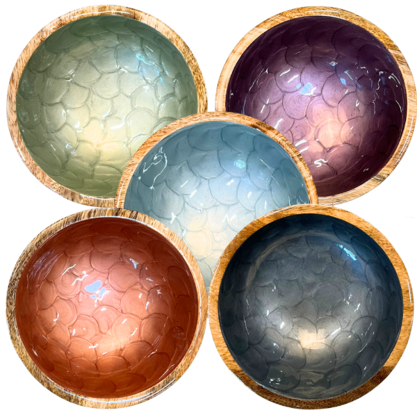 If you are looking for a single colour design, our beautiful hand painted mango wood bowls in a pearl finish, dress any table. They can be used as serving dishes or individual decorative pieces.